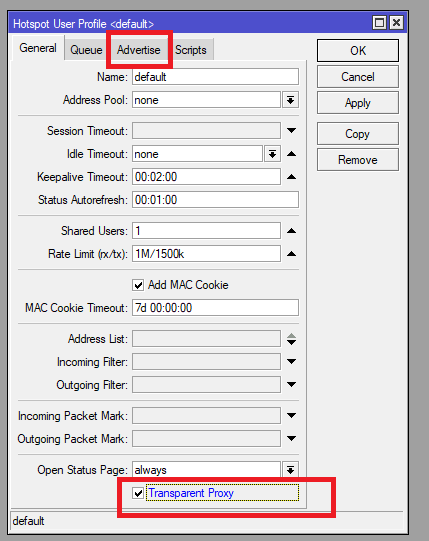 Warning.! .. menggunakan metode advertise di hotspot user profile membutuhkan “transparent proxy”, kita harus centrang “transparent proxy” pada tab general.