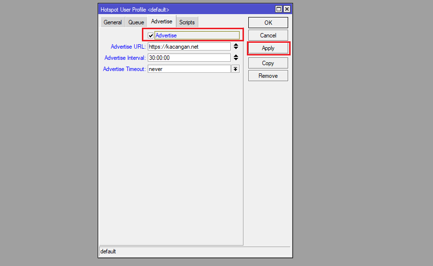 Selanjutkan centang advertise, lalu masukkan url yang ingin di tampilkan. Lihat gambar. Jika sudah selesai maka klik apply atau Ok